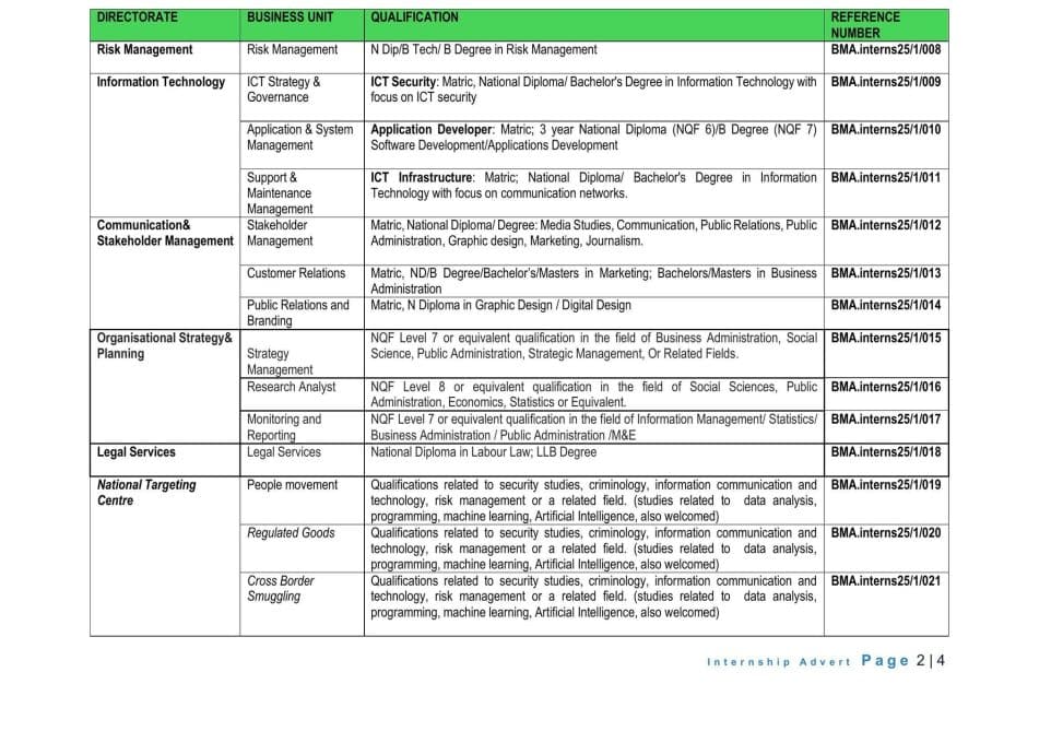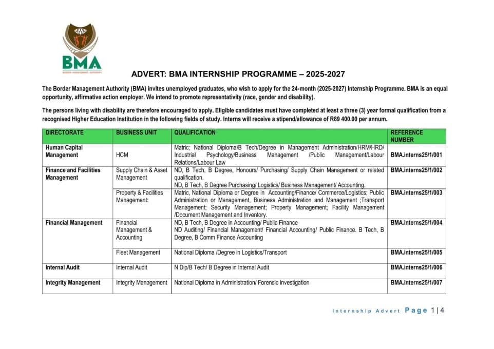 The Border Management Authority (BMA) is calling on unemployed South African graduates between the ages of 18 and 35 to apply for its 24-month internship programme.
